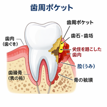 歯周ポケットはその名のとおり形態が服のポケットに似ています。服の胸のところにポケットがあり中にコインがあることを想像してください。もし服のポケットが浅ければ指で簡単にコインを取り出すことができます。しかしポケットが深くなればなるほどコインを取り出しにくくなりますし、あまりに深いとコインに手が届きません。歯周ポケットの中には歯周病の原因であるデンタルプラークや歯石が有ります。もし歯周ポケットの深さが2ミリ程度であれば、歯ブラシや補助的器具でポケット内のプラークを除去することができ、歯周組織を良好に保つことが容易になります。しかし歯周ポケットが4ミリ以上になれば歯医者さんで専門的な器具を用いても、ポケット内の歯石やプラークを完全に除去することが難しくなります。