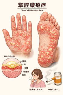 掌蹠膿疱症は、主として手掌(手のひら)や足跡(足の裏)に無菌性のブツブツ(小水疱や膿胞)が多数生じ、数日で乾燥してかさぶたになってはがれ落ち、また新たに生じるということが繰り返される慢性の難治性疾患です。若干、女性に多く、40~50代に発症のピークがあります。