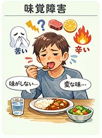 味を感じるにはまず食物の味成分がだ液に溶け出す必要がありますので、だ液の分泌が不十分な場合(ドライマウス)、苦く感じたり味覚異常を起したりします。またお薬の副作用で口が乾くことがありますし、味覚そのものに異常を起こす薬剤も多数存在します。正常な味覚を保つ上で、必須微量元素の一つである亜鉛が不可欠です。