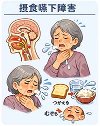 口腔の機能が低下して摂食嚥下の運動がスムーズに行われなくなると、食塊の一部が気道に誤って流れてしまう誤嚥が生じるようになります。肺への通り道である気道に食べ物が入ろうとするのを押し出そうとする反射がむせです。誤嚥は加齢により増加する傾向がありますが、脳血管障害、パーキンソン病、喫煙者、慢性呼吸器疾患のある患者さんに特に多く見られます。また誤嚥によって肺へ入った細菌は恐ろしい肺炎の原因になることも知られています。