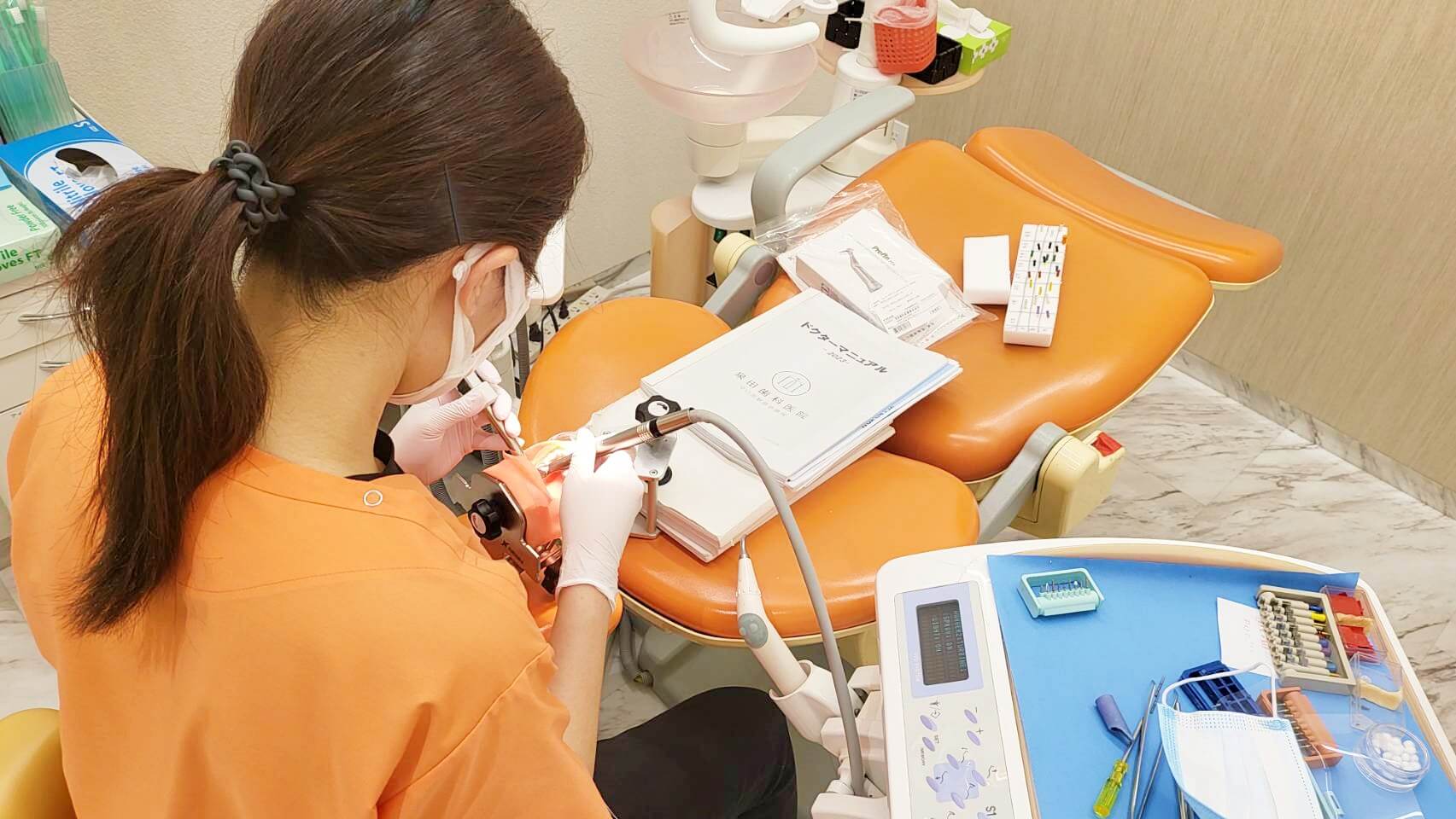 当医院では、マネキンと人工歯を用いての形成実習、エンド用模型での根充実習など、まず模型で満足のいく結果を出してから臨床に臨むようにしています。