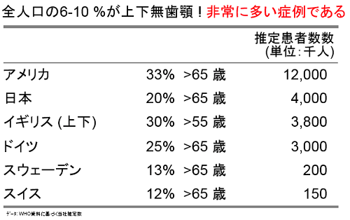 私たちの口腔は、日常生活の中で食事を始めとするさまざまな役割を果たしています。しかし、様々な原因で歯を失ってしまうことがあり、それが生活の質を下げる原因となることも少なくありません。歯がない(無歯顎:むしがく)の方は意外と多く、10人に1人程度が無歯顎とも言われています。