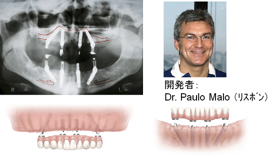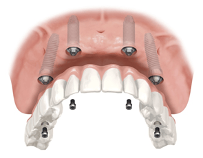 以前は無歯顎になってしまうと入れ歯(義歯)しか治療法がなかったのですが、近年は他の治療法も出てきました。注目されているのが「オールオン4」という治療法です。