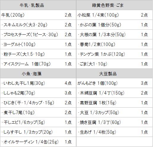 100mgを1点として、妊娠期は9点・授乳期は11点・成長期の子どもは9点・成人は6点が目標です。