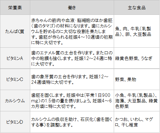 赤ちゃんの歯は妊娠中に作られます。 また、永久歯も早いものは妊娠4カ月頃から作られますので、この時期にカルシウムだけでなく バランス良く良質のたんぱく質・鉄分・ビタミン等も摂り、 強い歯を赤ちゃんにプレゼントしましょう。